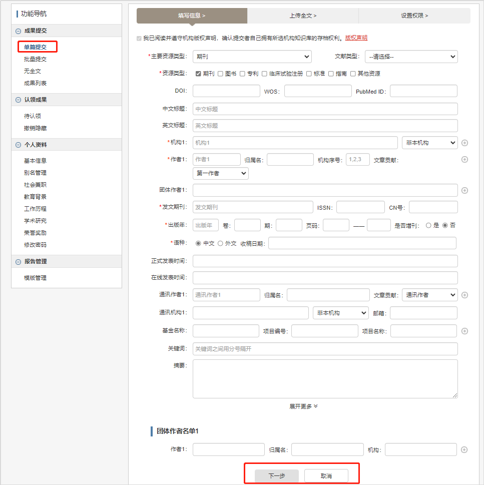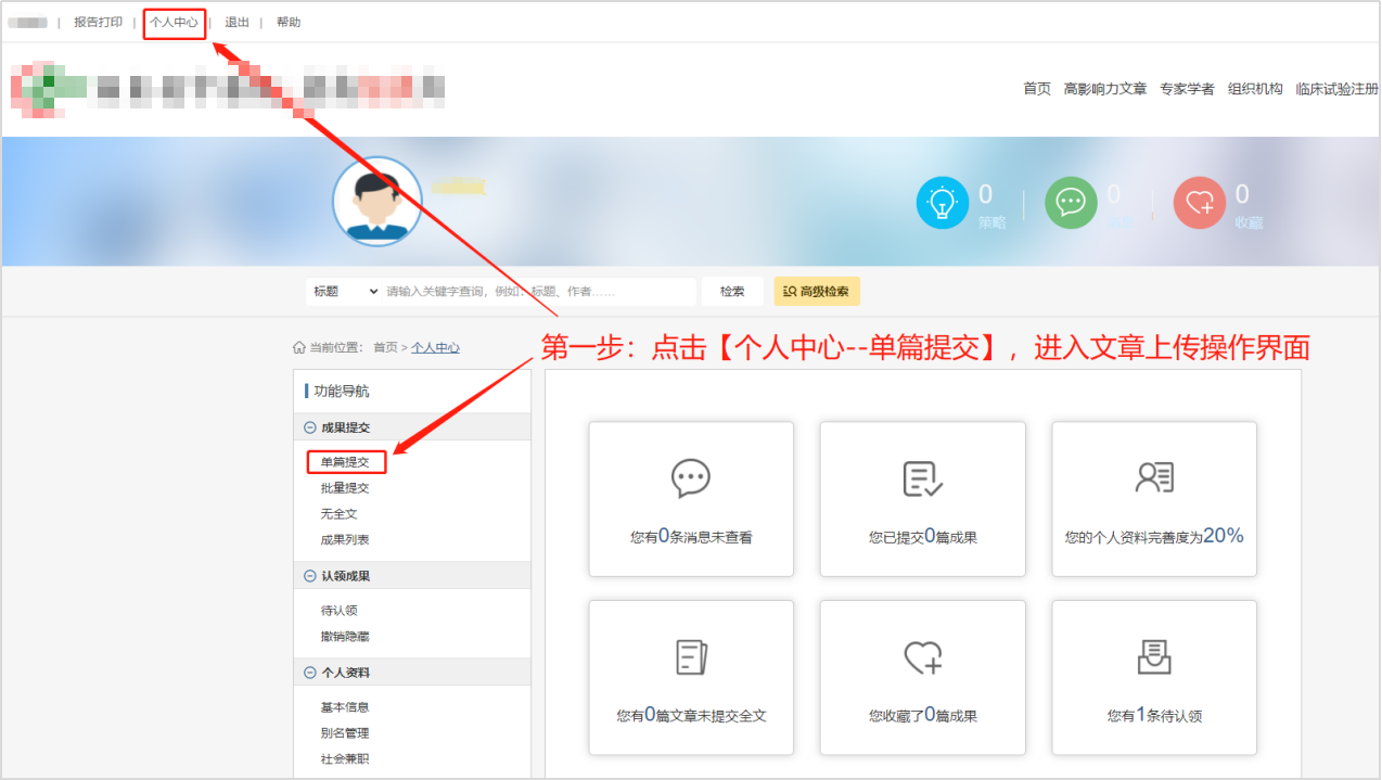 第一步:点击【个人中心—单篇上传】,进入文章上传操作