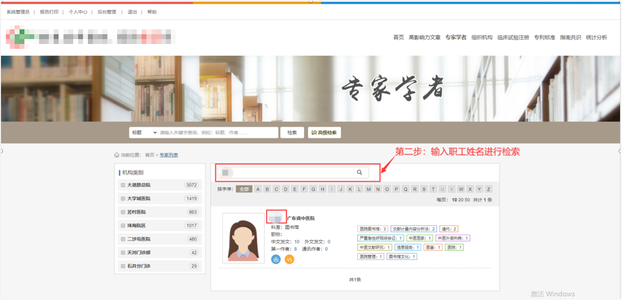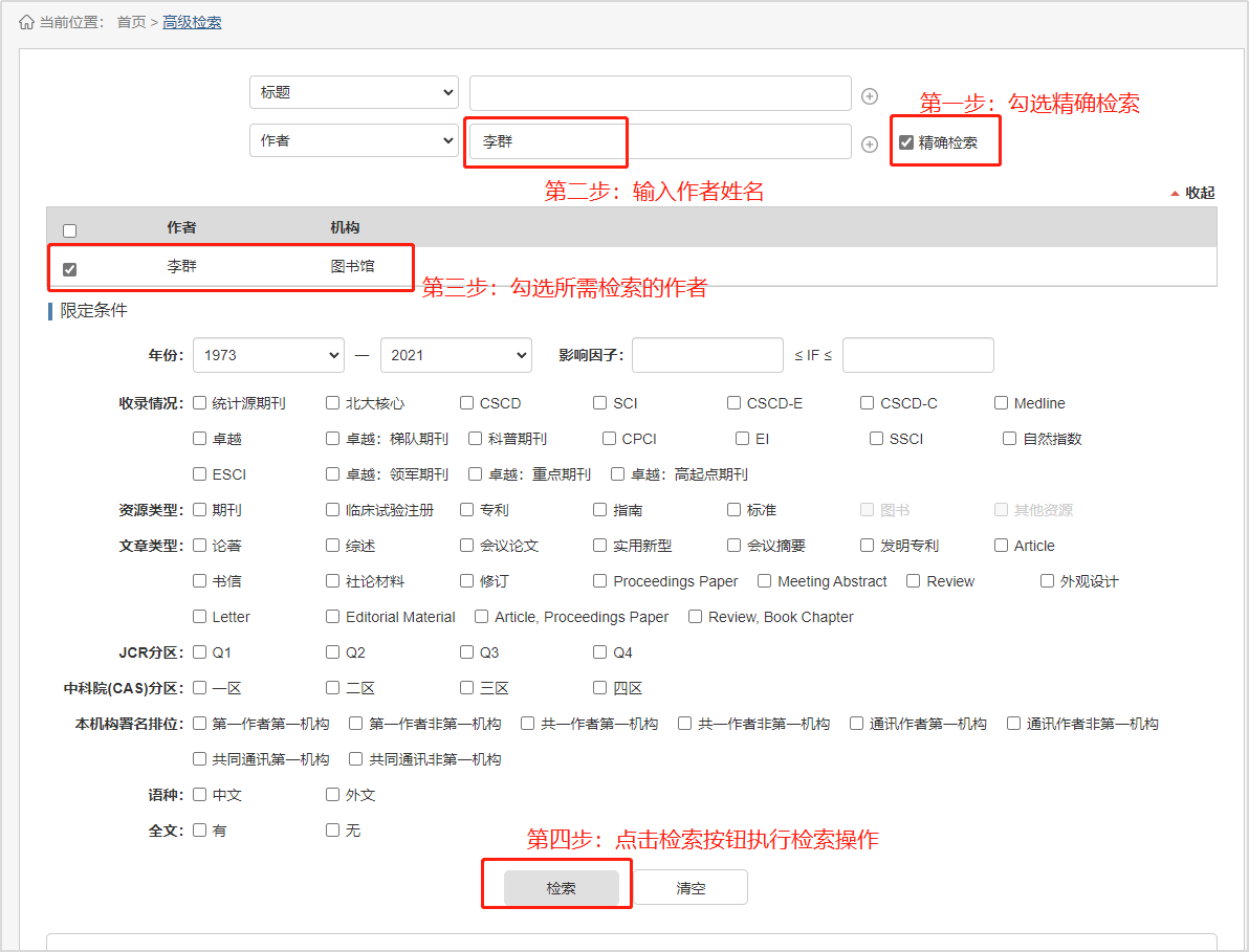 平台在高级检索中设置了本院职工的精确检索功能,具体操作如下: