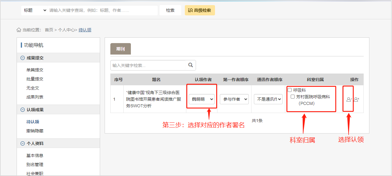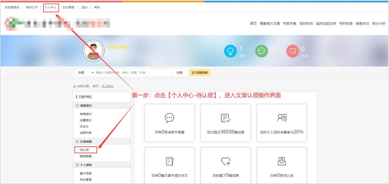 第一步:点击【个人中心--待认领】,进入文章认领操作