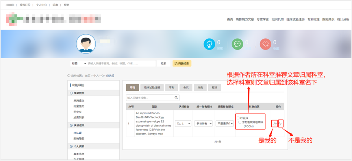 因作者发文归属是根据文章作者、科室署名、在职职工清单进行算法预归属的,对于医院历年职工同名、机构下未书写科室、英文拼音&缩写同名等原因,导致预归属偏差,此种情况需要作者进行成果认领。认领操作流程如下: