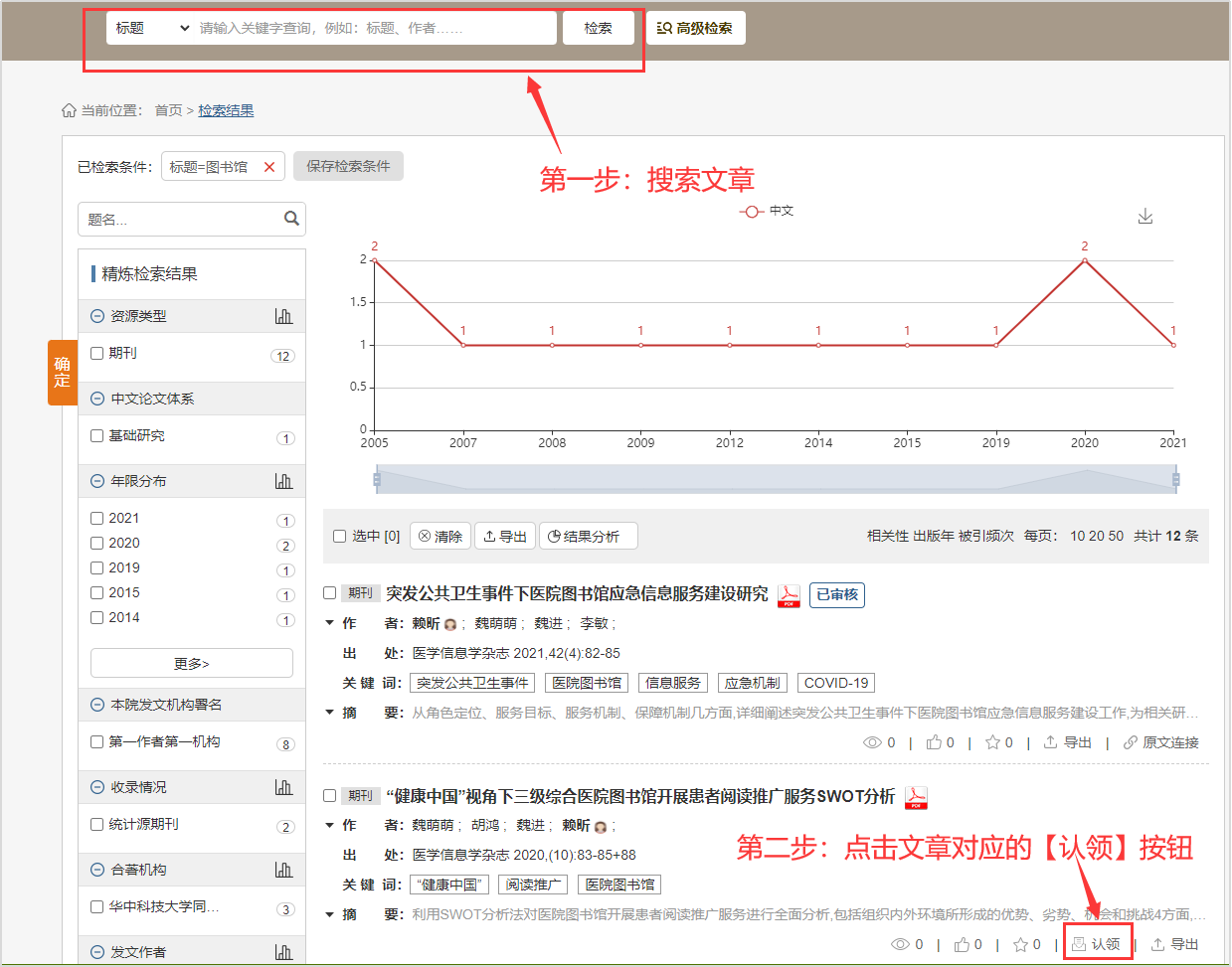 ①文章在机构知识库中,未能预归属到自己名下,此时只需在机构知识库中检索文到该篇文章,点击认领按钮进行上述问题(2)第二步中的认领操作即可